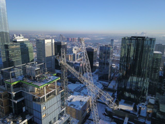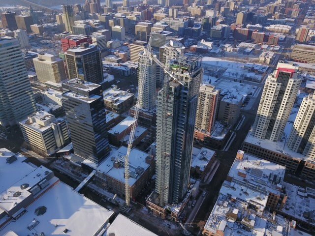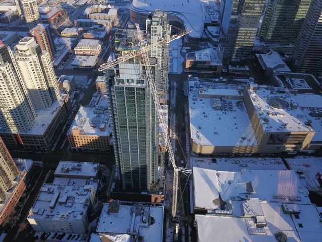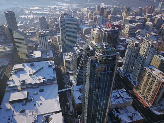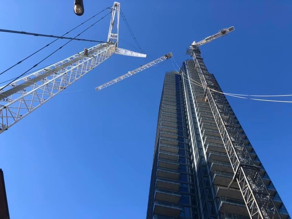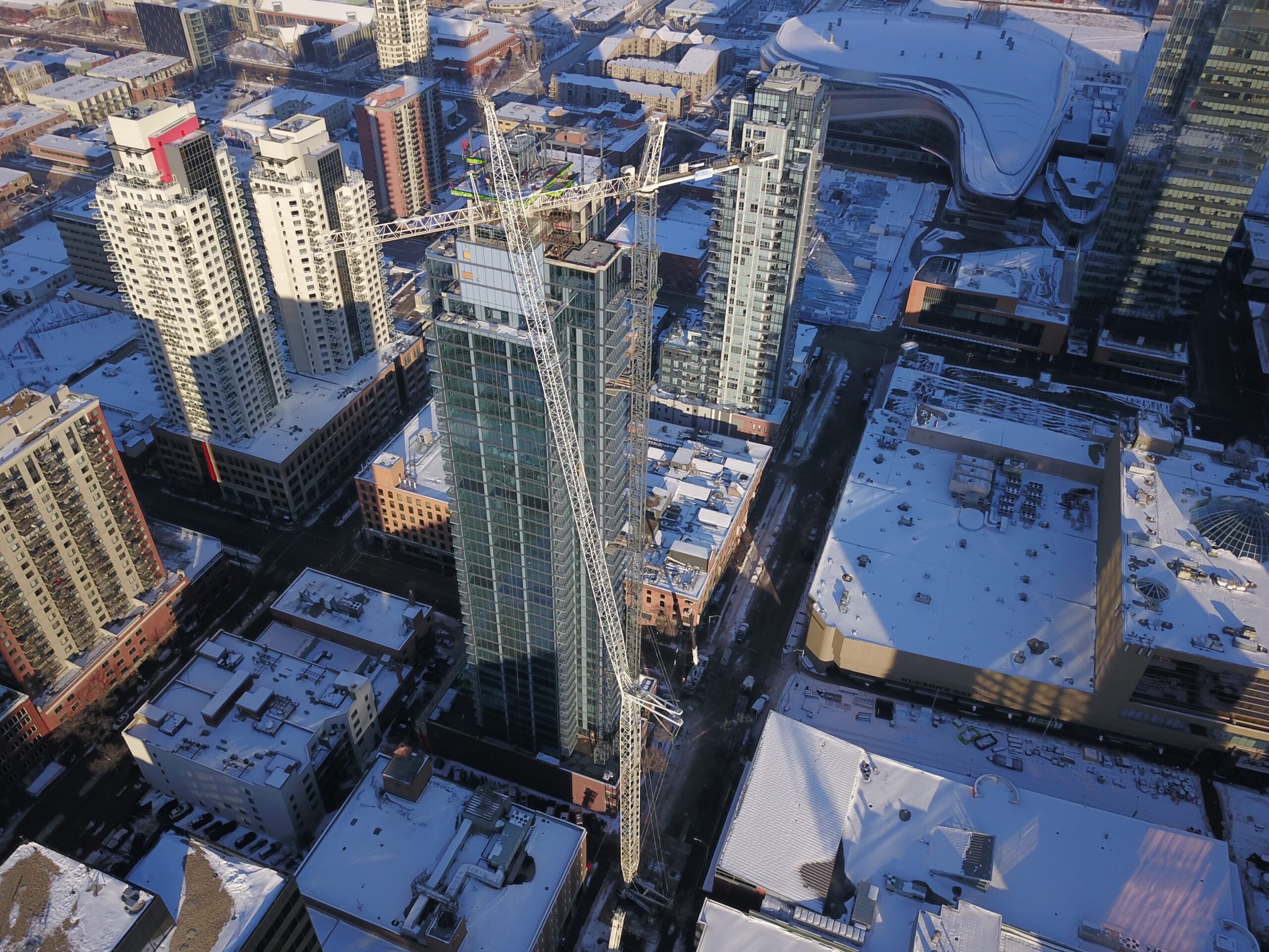 Myshak Crane & Rigging Ltd. (MCR) was contracted to support the dismantling of the SK415 tower crane from the Encore Tower project, located in the heart of downtown Edmonton, Alberta. This project posed several unique challenges, primarily due to a highly restricted timeline and the dense urban congestion of the Capital City. Given the location’s dense traffic and limited space, MCR had to develop a precise, efficient plan to complete all operations without affecting the city’s normal weekday activity.
