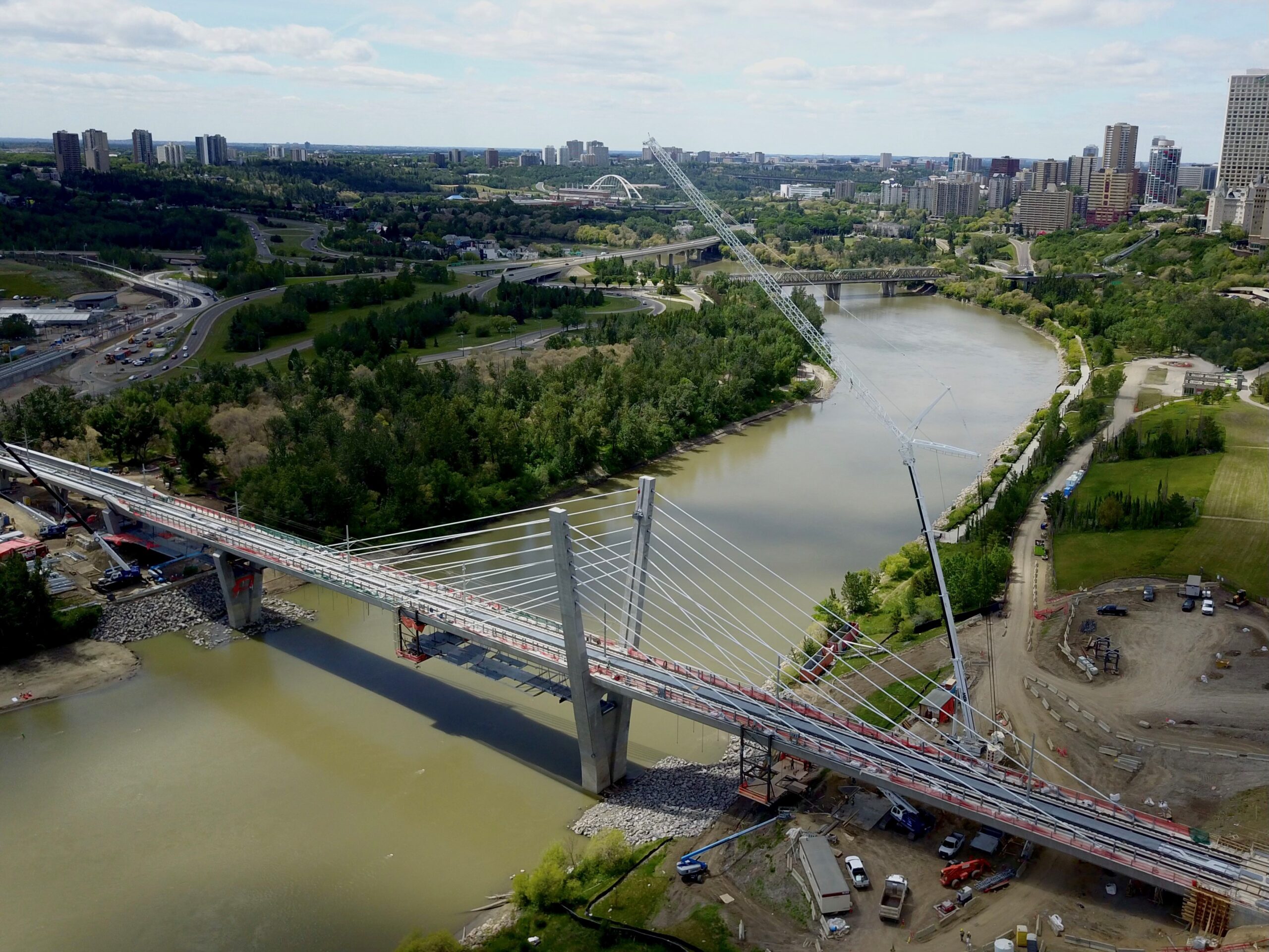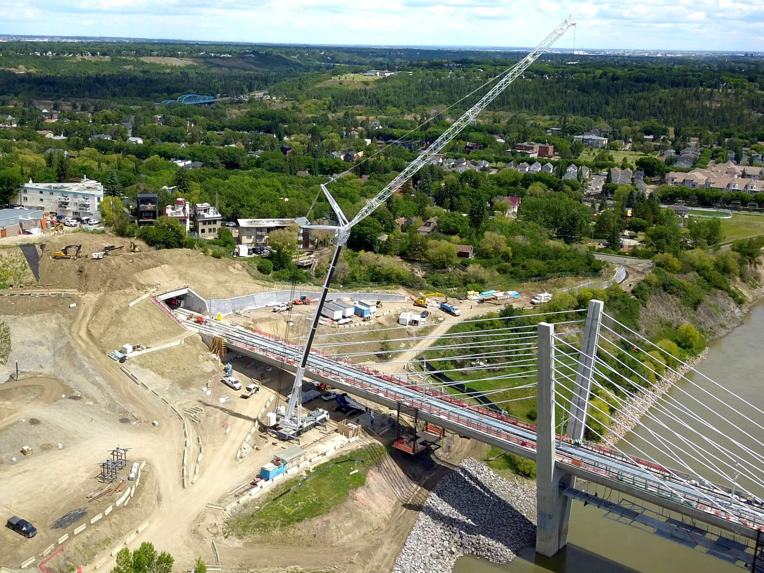 The project scope involved mobilizing a Liebherr LTM 1400 all-terrain crane equipped with a luffing jib and man basket, the crew was required to mobilize over a weekend to avoid restricting access to and from the site using the only available access road. Myshak Crane & Rigging Ltd. (MCR) was tasked with providing the crane, certified operator, necessary rigging and the man basket to support safe and effective access to the uppermost sections of the bridge piers for the finishing crews. In addition to supplying the equipment, MCR also provided on site support to ensure the successful execution of man basket operations.