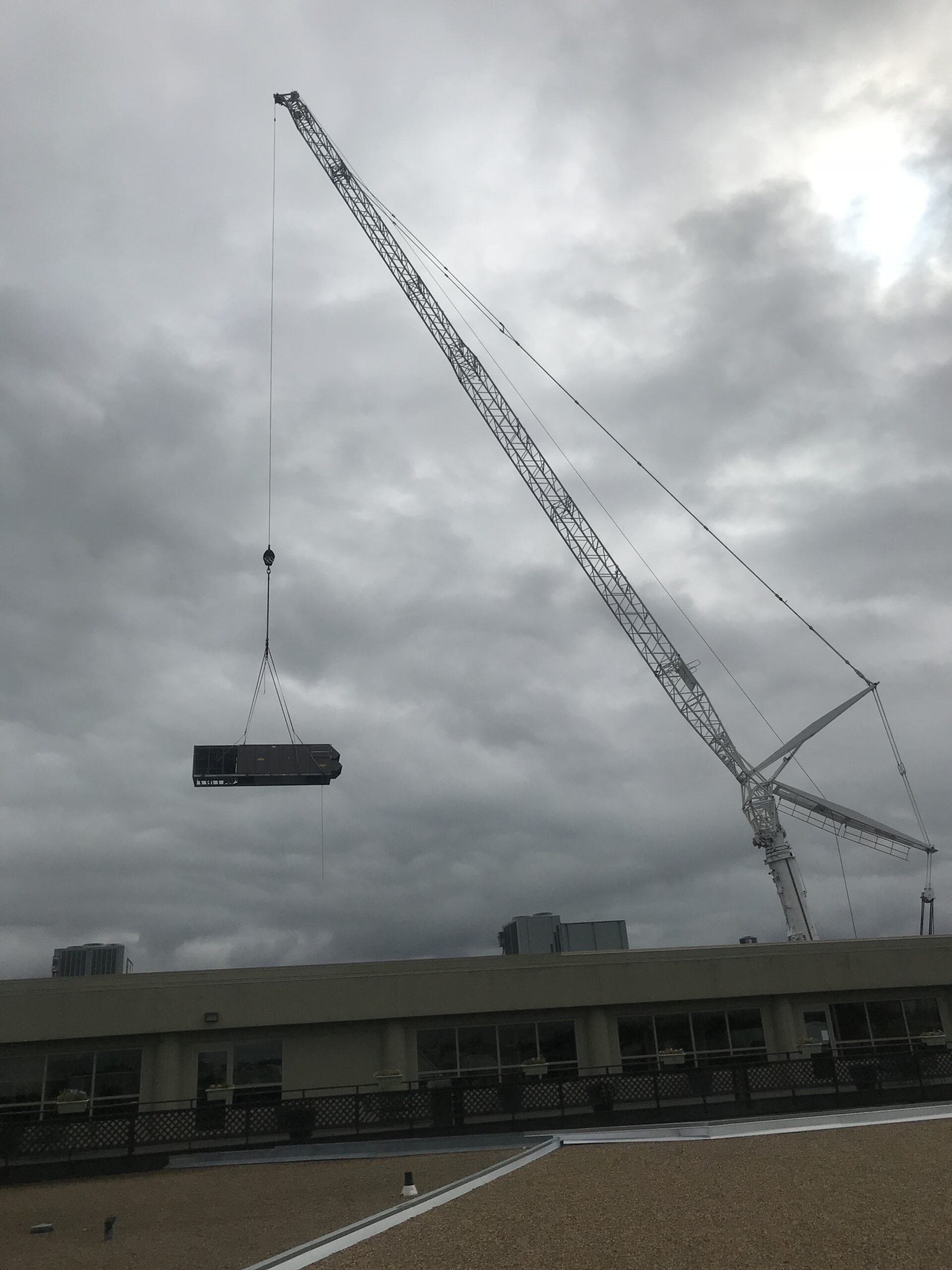 A Liebherr LTM 1400 All Terrain Crane equipped with a luffing jib was selected for this project. Its capabilities allowed for the necessary reach and lift capacity required to access the rooftop while maintaining a safe working perimeter. In addition to hoisting operations, Myshak Crane & Rigging Ltd. (MCR) provided transportation services to remove the old RTU from the site and ensure it was properly recycled in accordance with environmental and client standards.