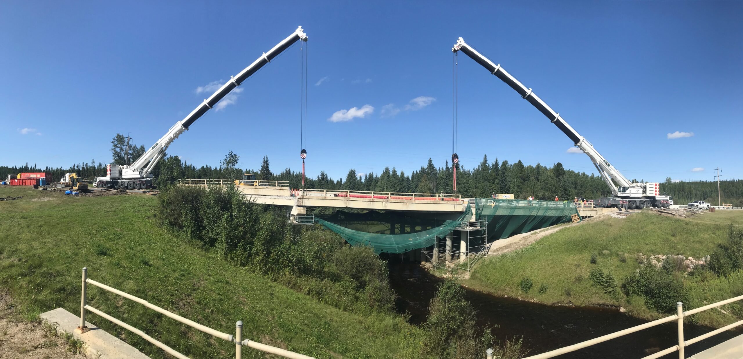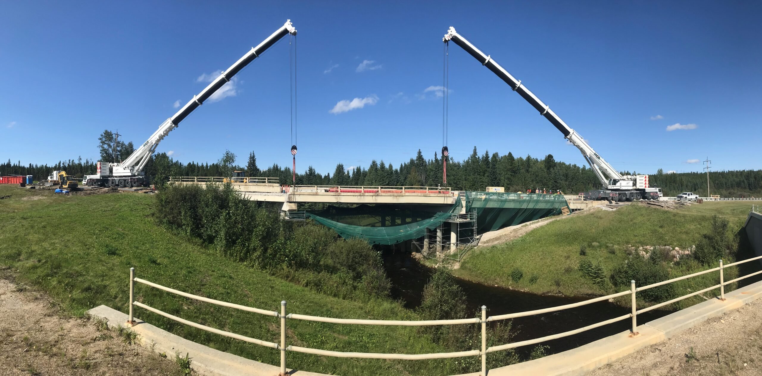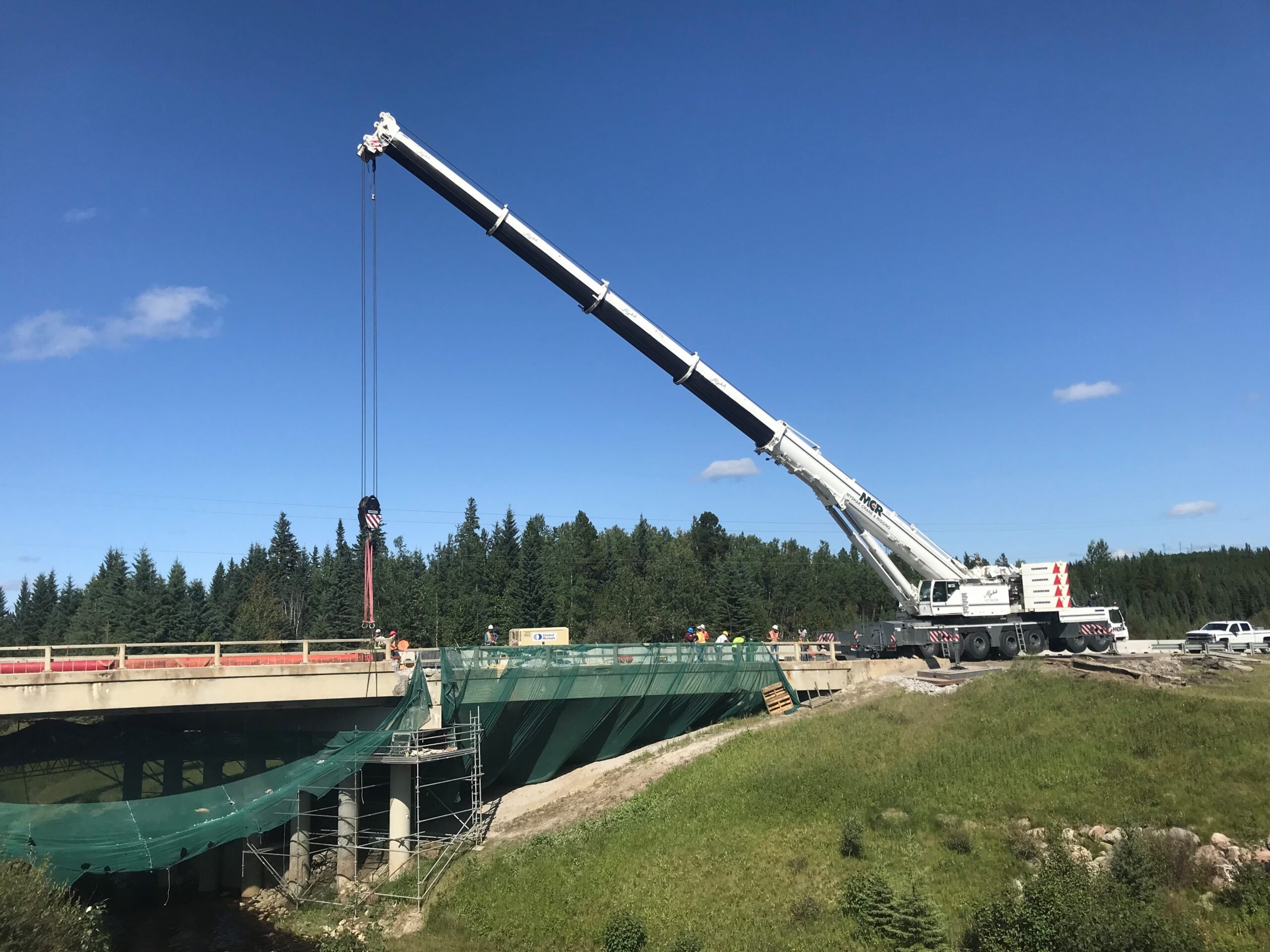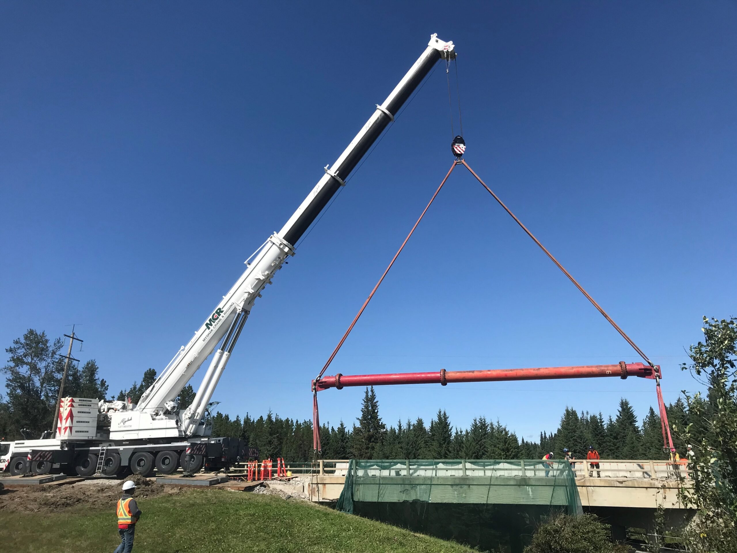 Myshak Crane & Rigging Ltd. (MCR) was engaged to support the replacement of aging bridge girders on a bridge located on Highway 43 in Alberta. The Two Creeks Bridge Girder Replacement project aimed to restore the structural performance of a critical link along this vital transportation corridor. The scope of work involved the removal and replacement of existing bridge girders, a task requiring a high degree of precision, operational control, and safety, particularly given the operational constraints of the site.